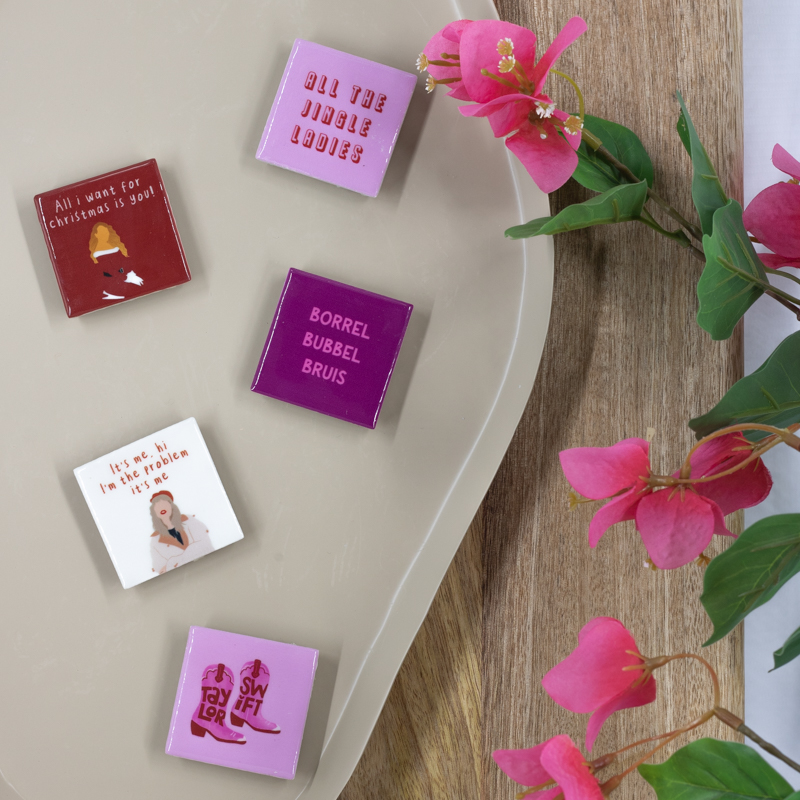 Bij Homebound hebben we een gloednieuwe collectie tegeltjes met inspirerende en grappige teksten. Deze tegeltjes zijn helemaal de nieuwe hype en geven elke ruimte een subtiele persoonlijke touch. Onze collectie omvat meer dan 300 unieke designs die variƫren van speelse quotes tot inspirerende boodschappen en zijn gemaakt van hoogwaardige materialen die duurzaamheid en stijl garanderen. Bovendien zijn ze betaalbaar, waardoor ze een ideaal cadeau zijn voor elke gelegenheid! Nu nieuw: magneettegeltjes! Onze populaire prints, verkrijgbaar op mini tegeltje met magneet. Perfect als cadeautje.